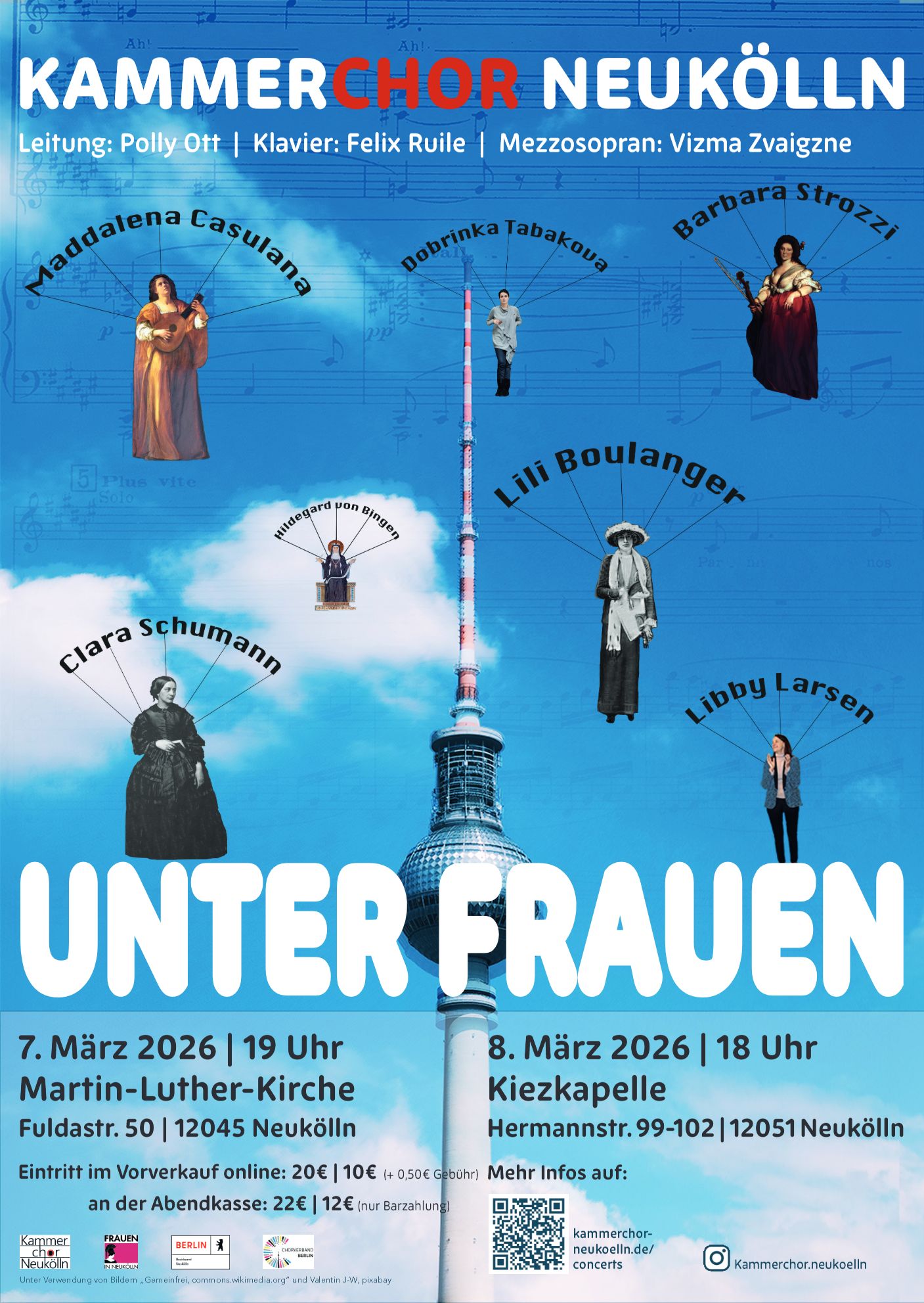 Der Kammerchor Neukölln lädt zu den Konzerten „Unter Frauen – Komponistinnen damals und heute“ ein – im Rahmen des Wochenendes rund um den Internationalen Frauentag.